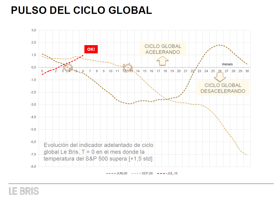 En el gráfico dibujamos la evolución de nuestro indicador adelantado de ciclo global en los meses posteriores a junio-00, septiembre-06 y julio-2016. Es interesante observar que los máximos en S&P 500 de cada ciclo se establecieron en los meses donde el indicador adelantado cambió de un estado de aceleración a otro de desaceleración. Recapitulemos con toda la información: