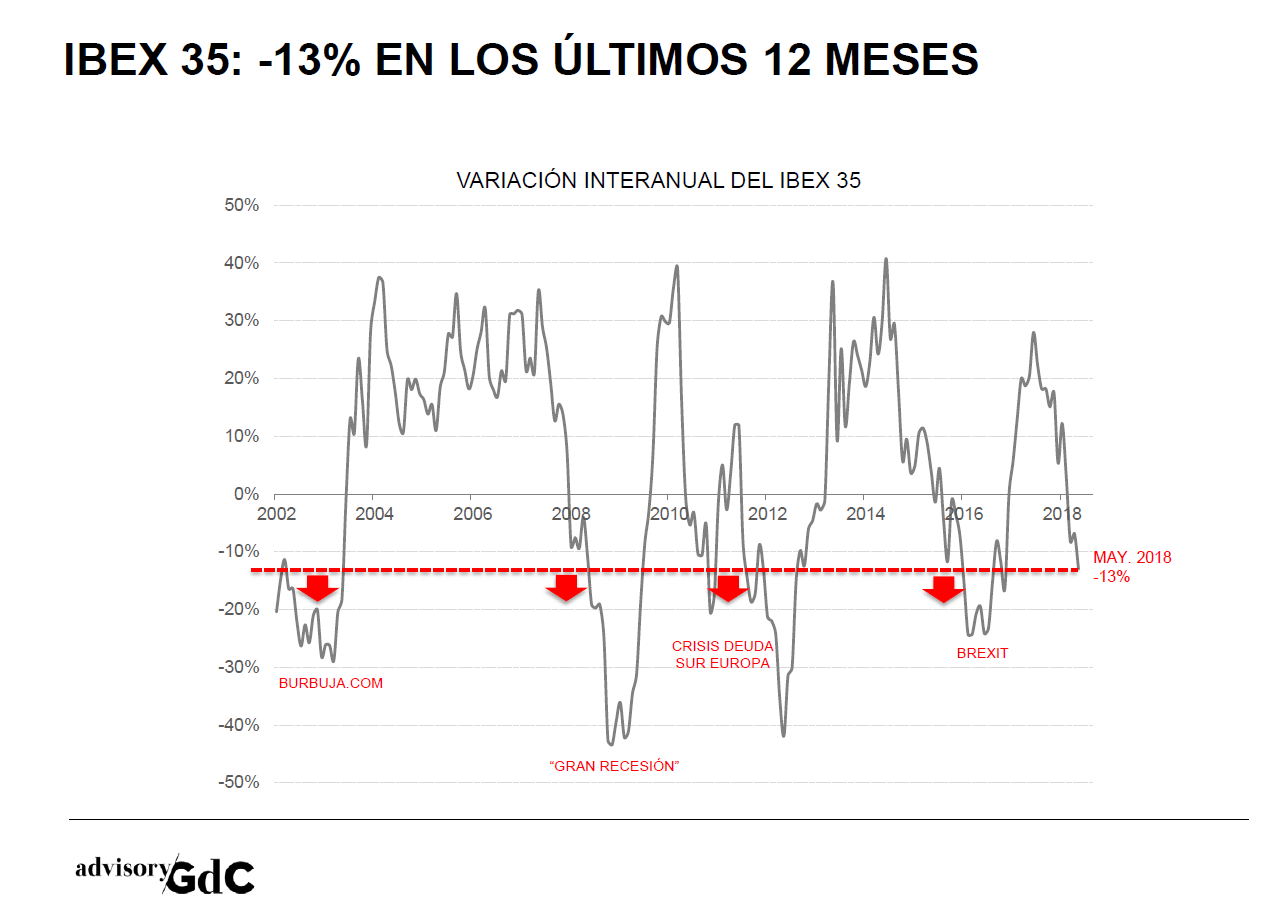 El IBEX 35 cerró el pasado mes de mayo en los 9.465 puntos, esto es un 13% por debajo de los niveles que alcanzó en el mismo mes de 2017 (10.880 puntos). Para encontrar una dinámica interanual tan negativa en los últimos años hay que recurrir a episodios de estrés muy concretos, enmarcados en crisis de carácter sistémico como el Brexit, la crisis de deuda y rescates en el área euro, la gran recesión o el estallido de la burbuja.com. En estos casos las caídas interanuales se situaron en el rango del -20% / -40%.