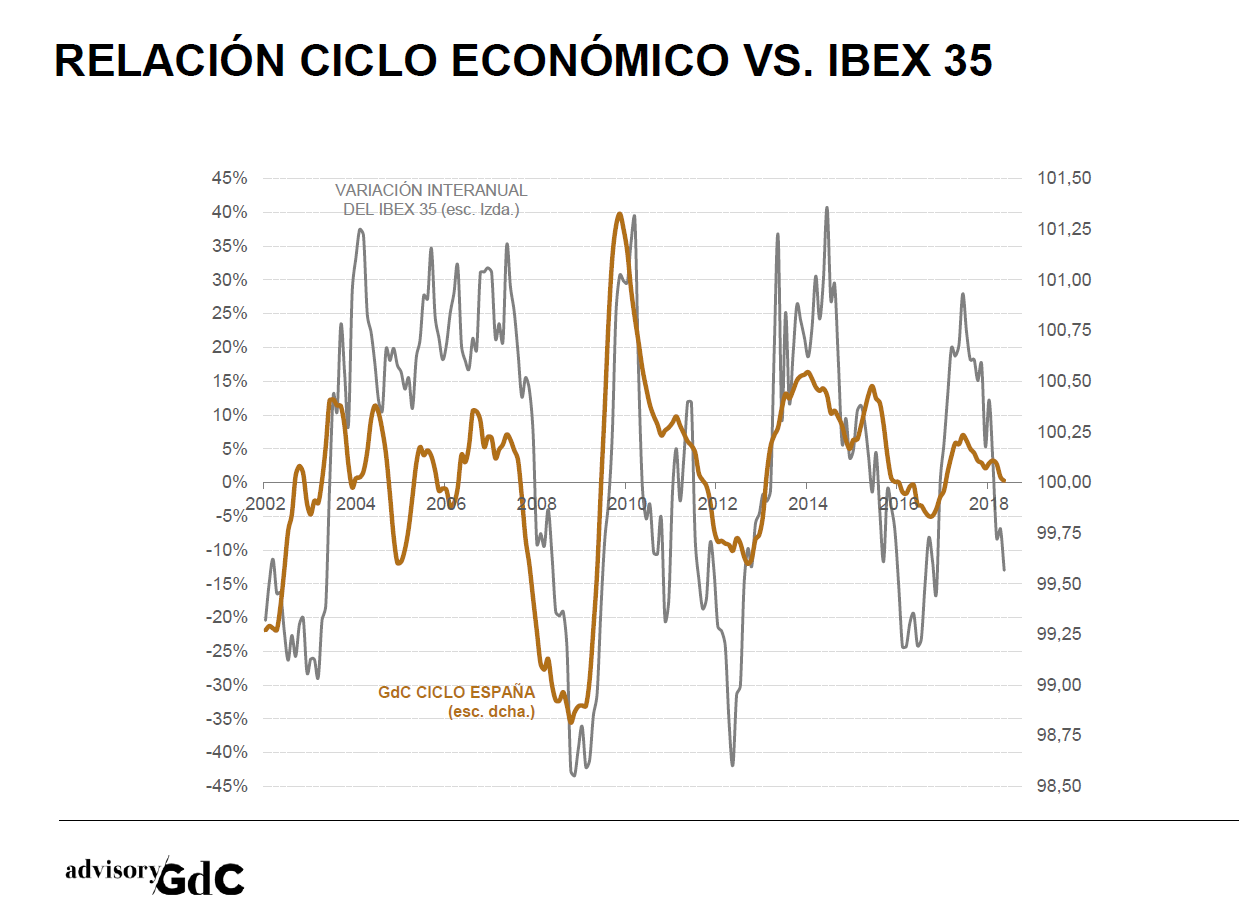 En los últimos 12 meses no encontramos un episodio de estrés comparable a los cuatro mencionados, pero sí hay una acumulación de incertidumbres que están afectando a la evolución del IBEX 35. Algunas con acento global (tensiones comerciales y proteccionismo), otras en área euro (agenda política italiana) y también problemas locales (crisis Cataluña). Acumulación de focos de riesgo que, unido a la madurez del ciclo económico en algunos bloques (EEUU), están desplazando a nuestros indicadores adelantados de actividad hacia una fase de desaceleración, dejando atrás el punto álgido de la fase expansiva.