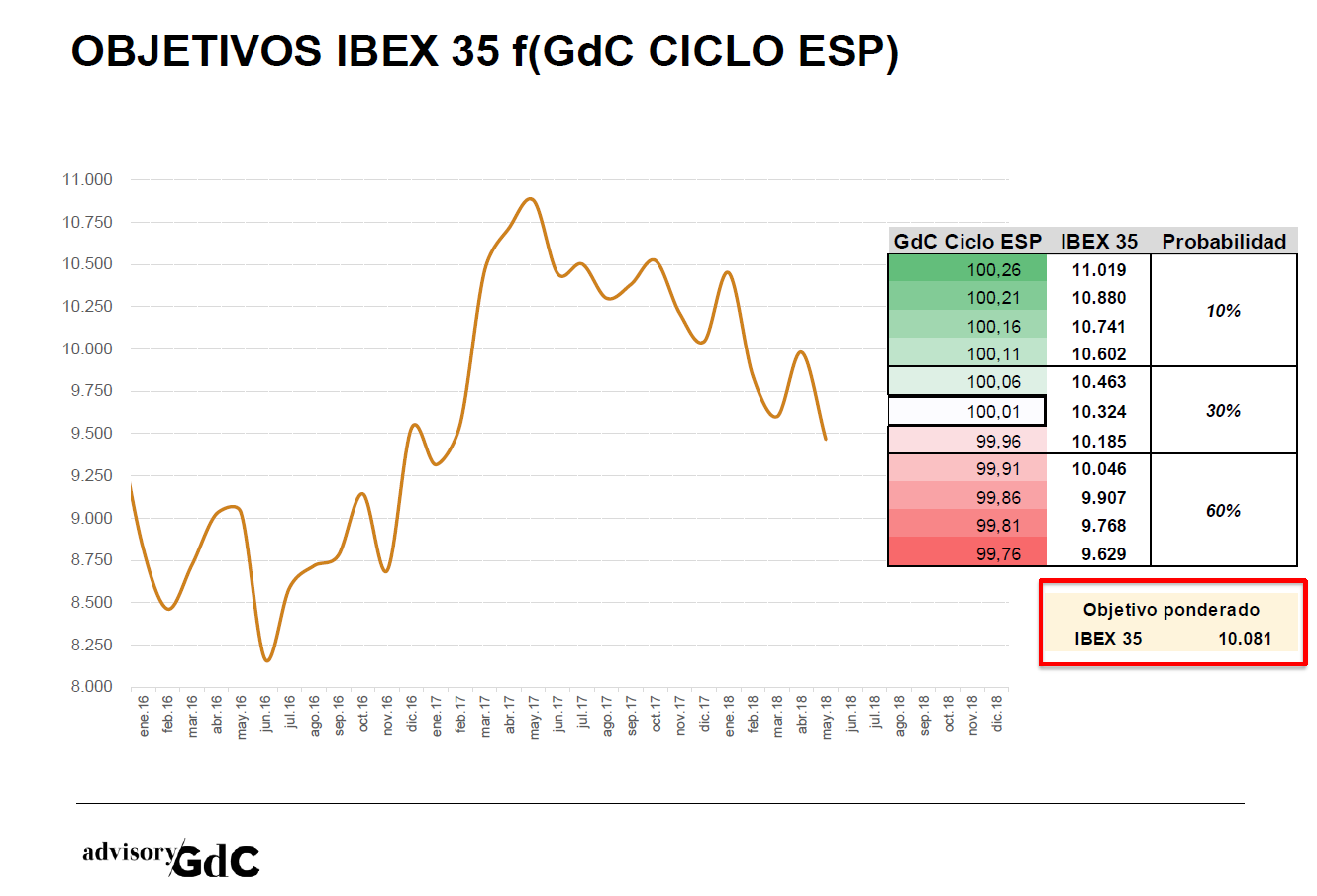 El resultado final, teniendo en cuenta las ponderaciones, es de un objetivo para el IBEX 35 en 10.081 puntos a finales de año. Estaríamos ante un año en rango, volátil y sin inercia alcista. En la misma línea que apunta el análisis del GdC Ciclo Global para el MSCI World y GdC TAA del Eurostoxx.