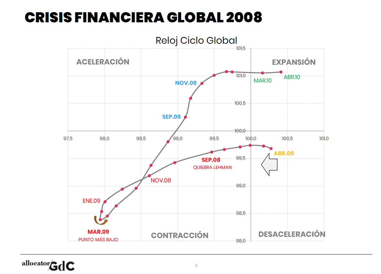 Interesante para comparar (i) intensidad de la caída que veremos en los próximos meses, (ii) plazos temporales de transición entre cuadrantes y (iii) verticalidad de la recuperación.