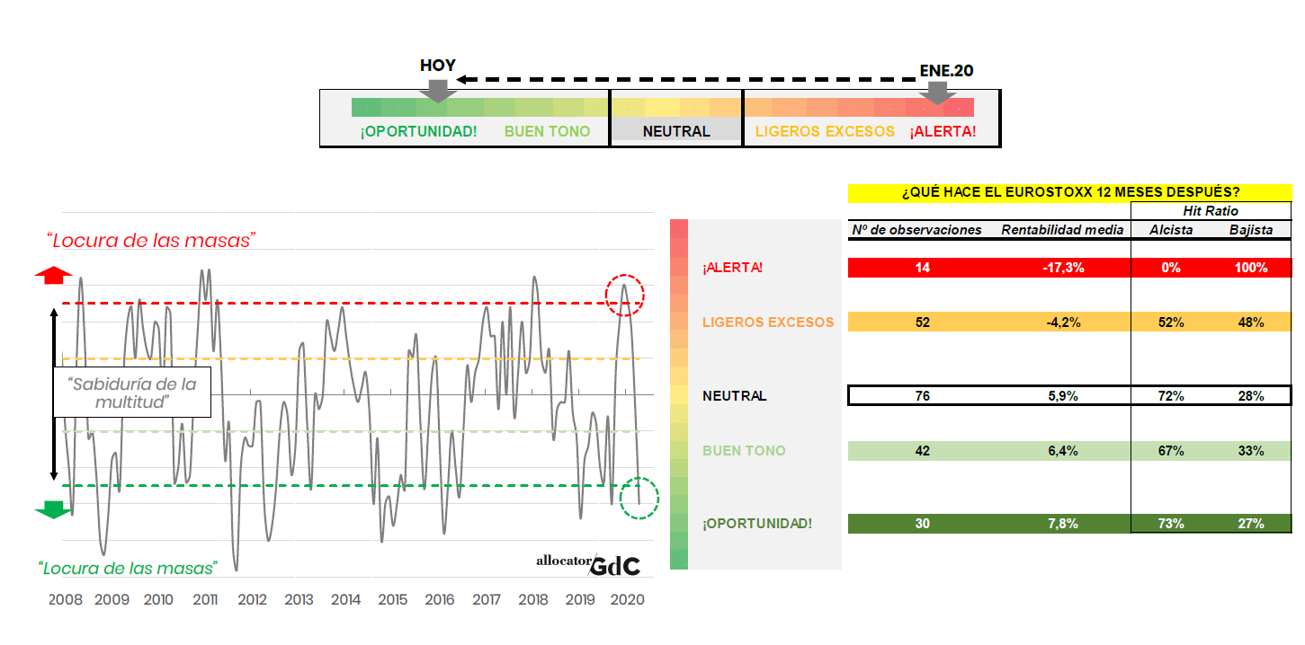 En el siguiente gráfico mostramos la evolución del análisis del ciclo de mercado que hacemos para la renta variable europea. En los tres primeros meses de 2020 ha pasado de la “locura de las masas” (Alerta bajista) al extremos contrario de “locura de las masas” (Oportunidad alcista).