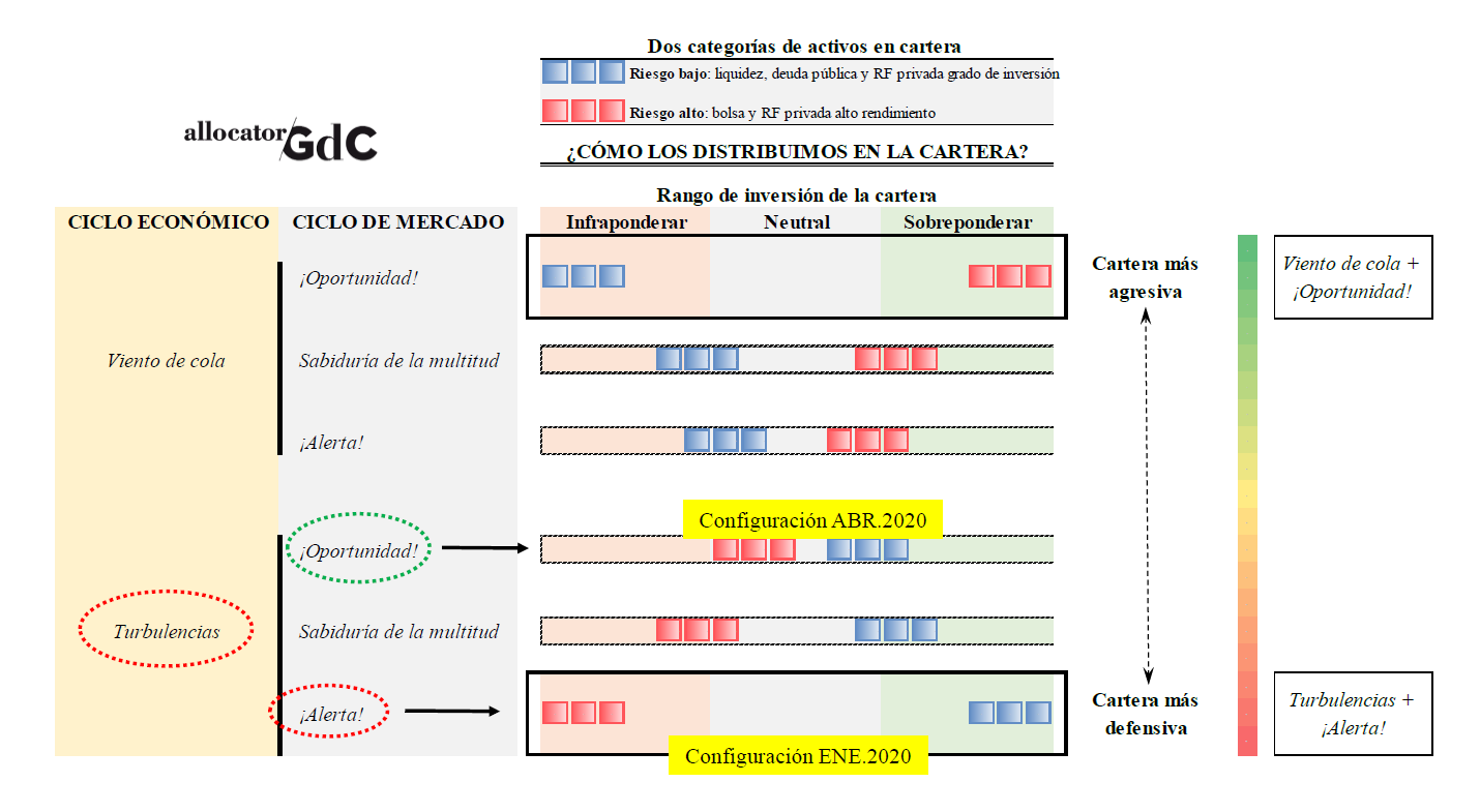 En la siguiente tabla está el detalle de esas SEIS carteras. Agrupamos en activos de riesgo bajo y alto las categorías que tenemos en cartera, y en función del estado de ambos ciclos, económico y de mercado, se obtiene una configuración. La más defensiva sería la que teníamos en enero (turbulencias + alerta). Ahora hay una nueva configuración ante el cambio de alerta a oportunidad. La cesta de activos de riesgo ha pasado a una posición neutral desde la extrema infraponderación de inicio de año.
