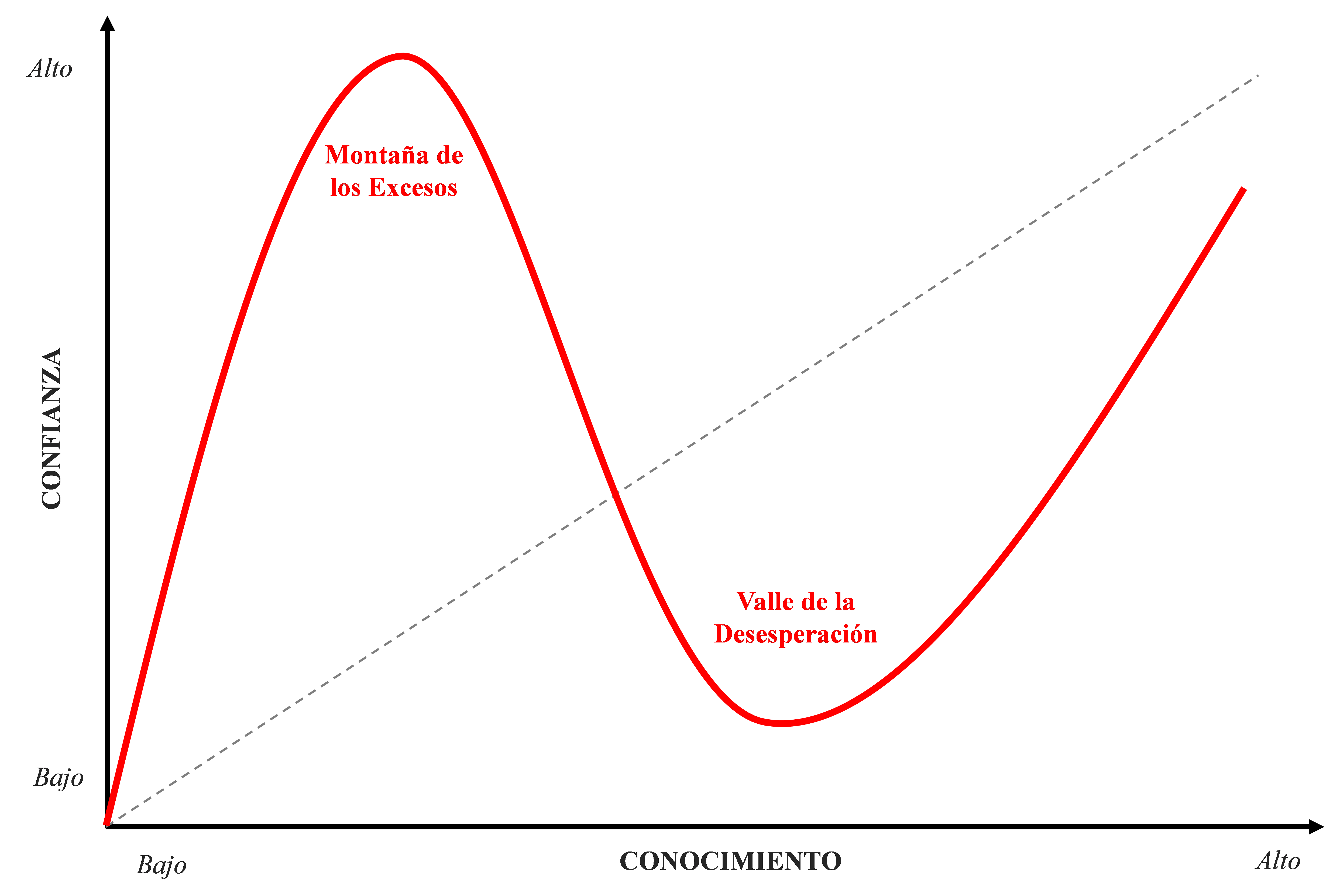 Profundicemos en esta última reflexión: la relación Confianza / Conocimiento. Entre ambas variables debe existir un cierto equilibrio para evitar subir por una “Montaña de los Excesos” donde aumenta de forma exponencial la probabilidad de cometer errores. En ocasiones, hay información que obtenemos para encarar un problema complejo que rompe esta proporcionalidad, aumentando de forma acusada la Confianza y apenas ampliando la base del Conocimiento. Un ejemplo sería cuando la información parte de premisas y suposiciones muy alejadas de la realidad del problema que se pretende abordar. El sesgo de la ilusión de control puede causar estragos cuando te encuentras en lo alto de la Montaña de los Excesos, cuando todo lo sabemos.