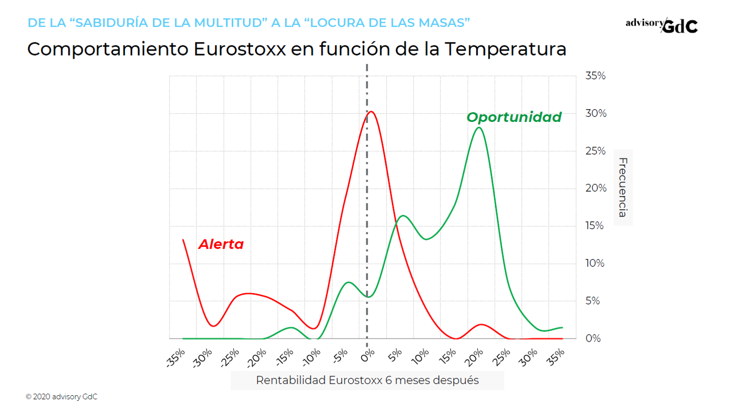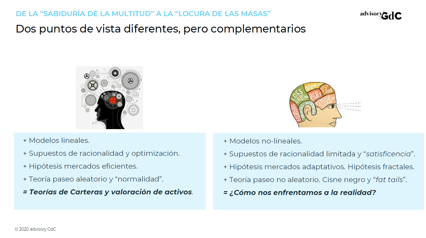 Además de comprender el tipo de entorno que se está desarrollando en el ámbito macro, es imprescindible estudiar el ciclo de los mercados financieros. Un ciclo que oscila entre la euforia y la depresión; entre la sobrevaloración y la infravaloración; entre el pánico y la codicia. Características que se observan en los dos extremos del ciclo del ciclo de mercado, cuando la sabiduría de la multitud se transforma en locura de masas.