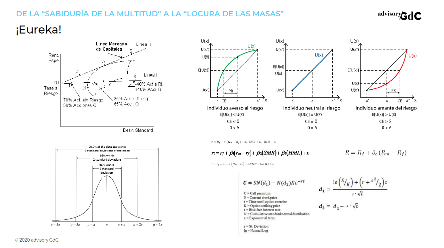 Cuando tamizamos la realidad de los mercados financieros por esta batería de hipótesis, emergen toda una serie de relaciones lineales y fórmulas que explicarían los movimientos de los activos financieros si se cumplieran esas hipótesis. El problema quizás no sean las predicciones de estas fórmulas o los modelos de gestión de riesgo que se derivan de estos análisis. El mal uso que hacemos de ellos también importa. La prudencia debería imperar sabiendo de las limitaciones de predicciones y modelos. Y de prudencia... más bien poco.