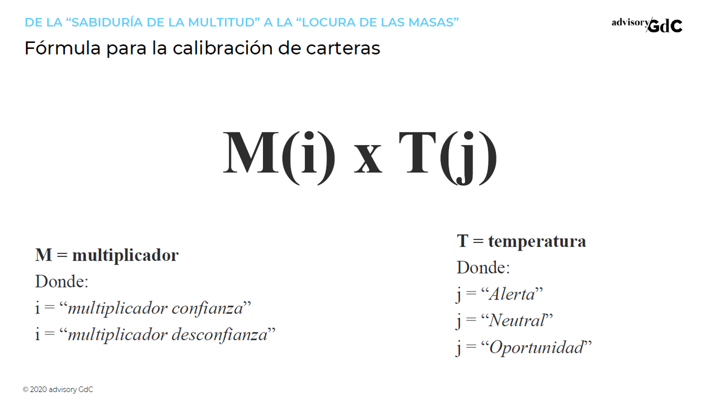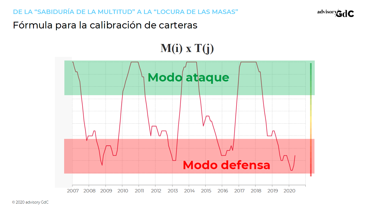 Tenemos, por tanto, toda una batería de fórmulas y modelos para la gestión de carteras y de riesgo que son útiles cuando el mercado está en “modo eficiente”. Pero también tiene otras caras, la de su propia naturaleza inestable, emocional, no lineal… Y aquí las fórmulas escasean. La propuesta de nuestra fórmula para calibración de carteras se sitúa en este plano, no parte de ninguna hipótesis y solo pretende aplicar sentido común a la realidad que se observa en los mercados financieros. No es ninguna fórmula mágica para calcular rentabilidades esperadas o hacer proyecciones de volatilidad u optimización teórica de carteras. Es una fórmula sencilla, intuitiva y en la que buscamos solo una respuesta: mi cartera de inversión ¿debe estar en modo ataque o modo defensa?