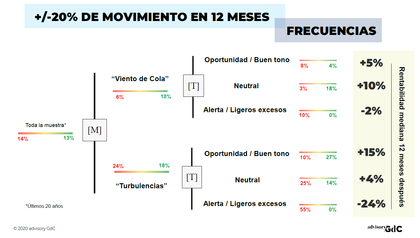 El estado actual de [M] es “viento de cola”, y en estos entornos se observa un adelgazamiento de los riesgos extremos (+/-20% de movimiento en 12 meses). La frecuencia de la cola negativa pasa del 14% al 6%, y también adelgaza la cola positiva aunque en menor proporción. Y ahora el segundo prisma…