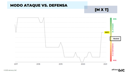 La combinación actual de MxT tiene una menor frecuencia de “riesgos de cola”. Que traducido a estructura de cartera supone una táctica ligeramente ofensiva (detalles en Allocator GdC) , muy diferente a la que planteamos hace justo un año cuando la combinación MxT apuntaba a una táctica defensiva máxima.