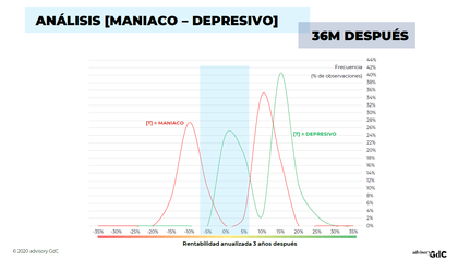 Y el comportamiento del índice 3 años después de lecturas de “manía” apunta a una cola negativa notable, donde la frecuencia de pérdidas anualizadas iguales o superiores al -10% es del 35%. Pero sigue sorprendiendo el peso del lado positivo en esta distribución “maniática”, aunque pesa menos que la “depresiva” (55% vs. 76%) son frecuencias altas cuando las comparamos con los resultados en otros índices.