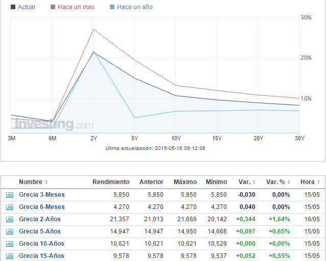 Lo curioso del caso es que esto no es normal y casi núnca sucede. Lo más habitual en los mercados de renta fija es que los fondos prefieran comprar renta fija a corto plazo y disponer de sus propios fondos cuanto antes y tener capital para aprovechar nuevas oportunidades del mercado si es que no prefieren vender el papel antes y especular con la deuda del país. No es el caso del país Heleno, pero porqué?