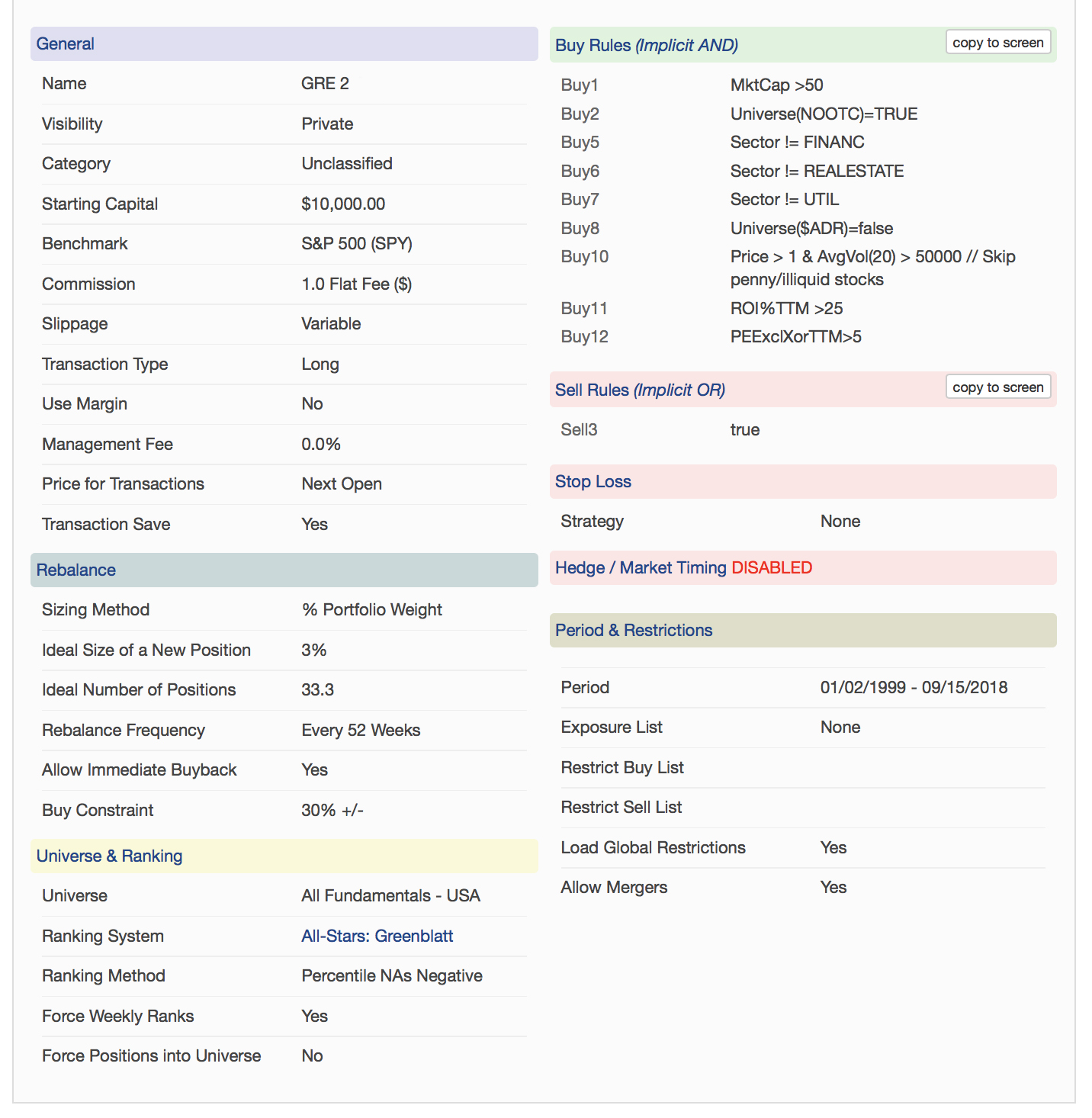 La segunda forma es usar el sistema de ranking de empresas que sale en la plataforma que utilizo para hacer los backtests (pego el código aquí abajo), y reproducir el sistema de Greenblatt en las condiciones de compra y venta.