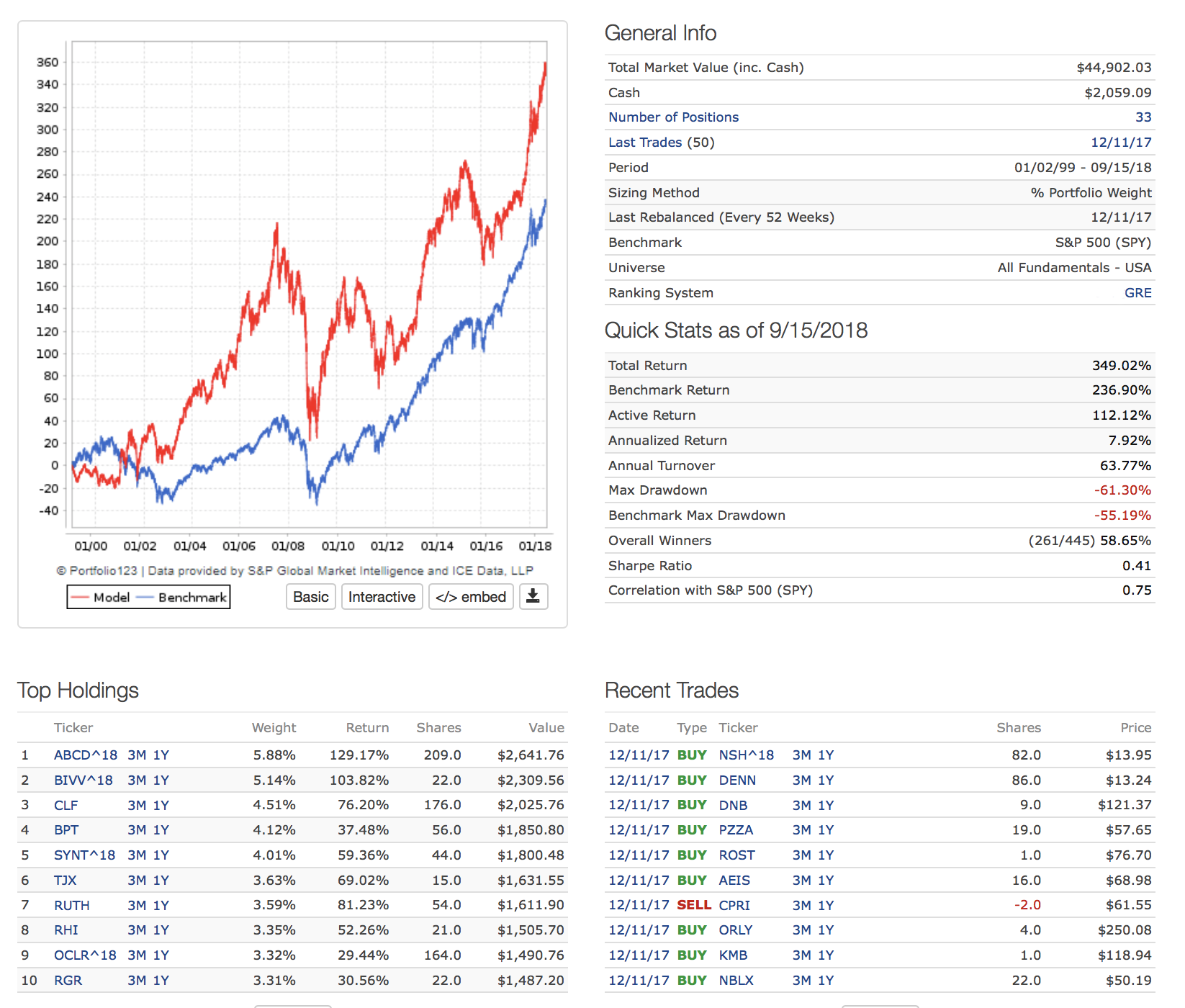 La última forma es tomar el sistema de Greenblatt como punto de partida, e intentar mejorarlo. Las mejoras que he realizado son ligeras. Una condición de market timing para reducir el drawdown, quitar la condición de P/E, si ranking menor de 70 vender, si hemos ganado más del 100% también vendemos y rebalanceo cada 13 semanas. That's all.
