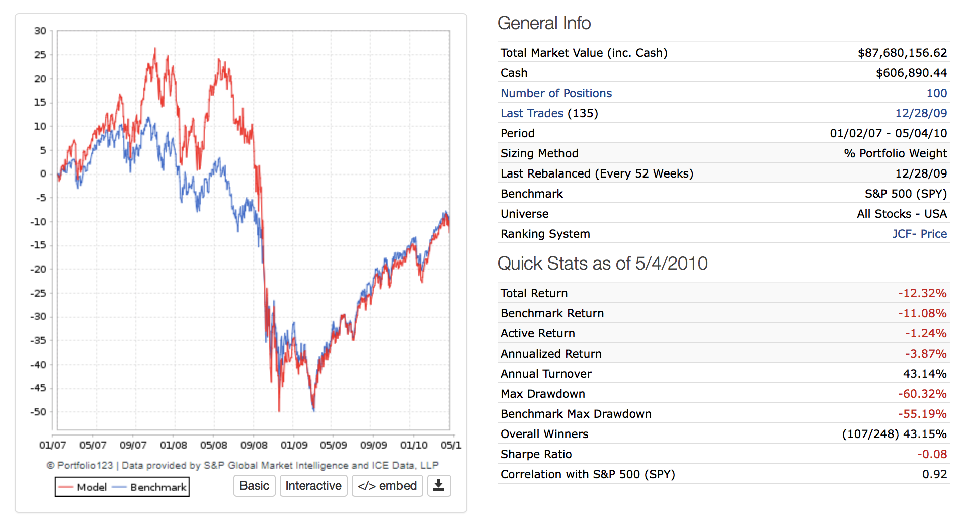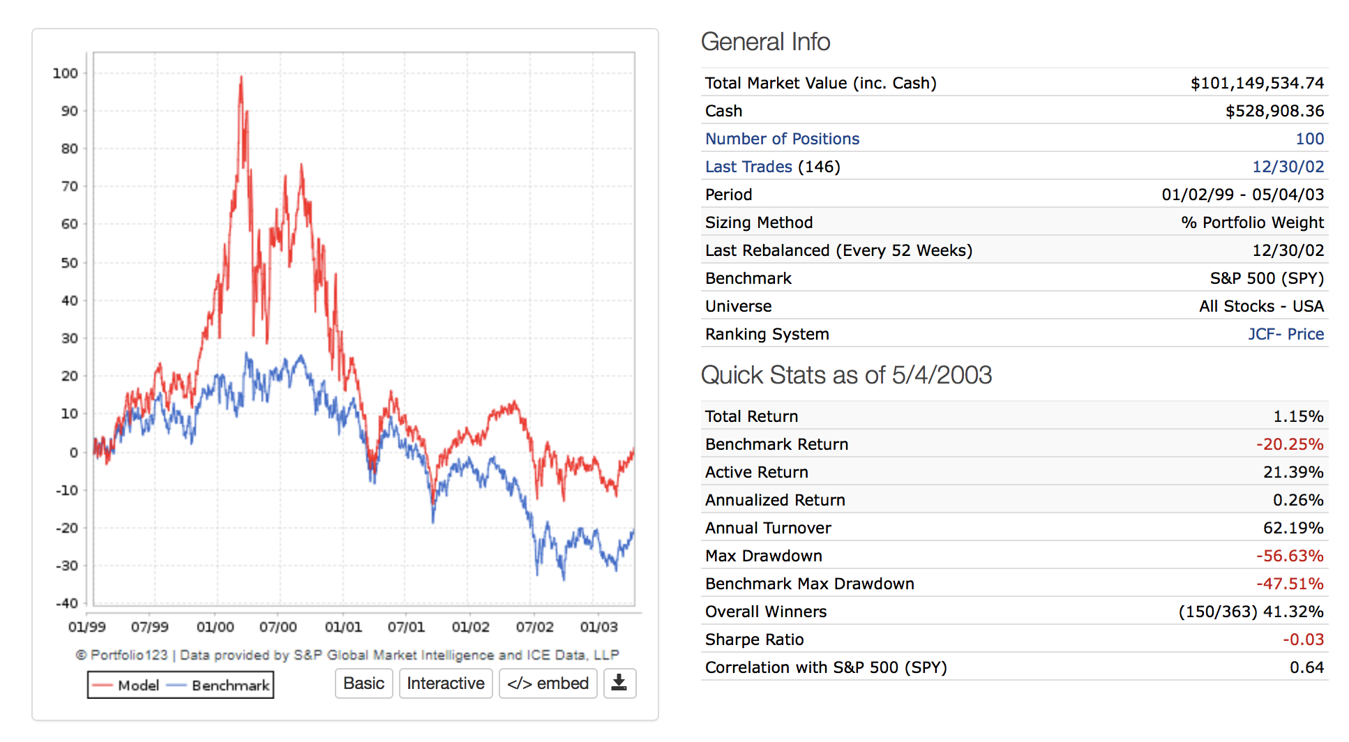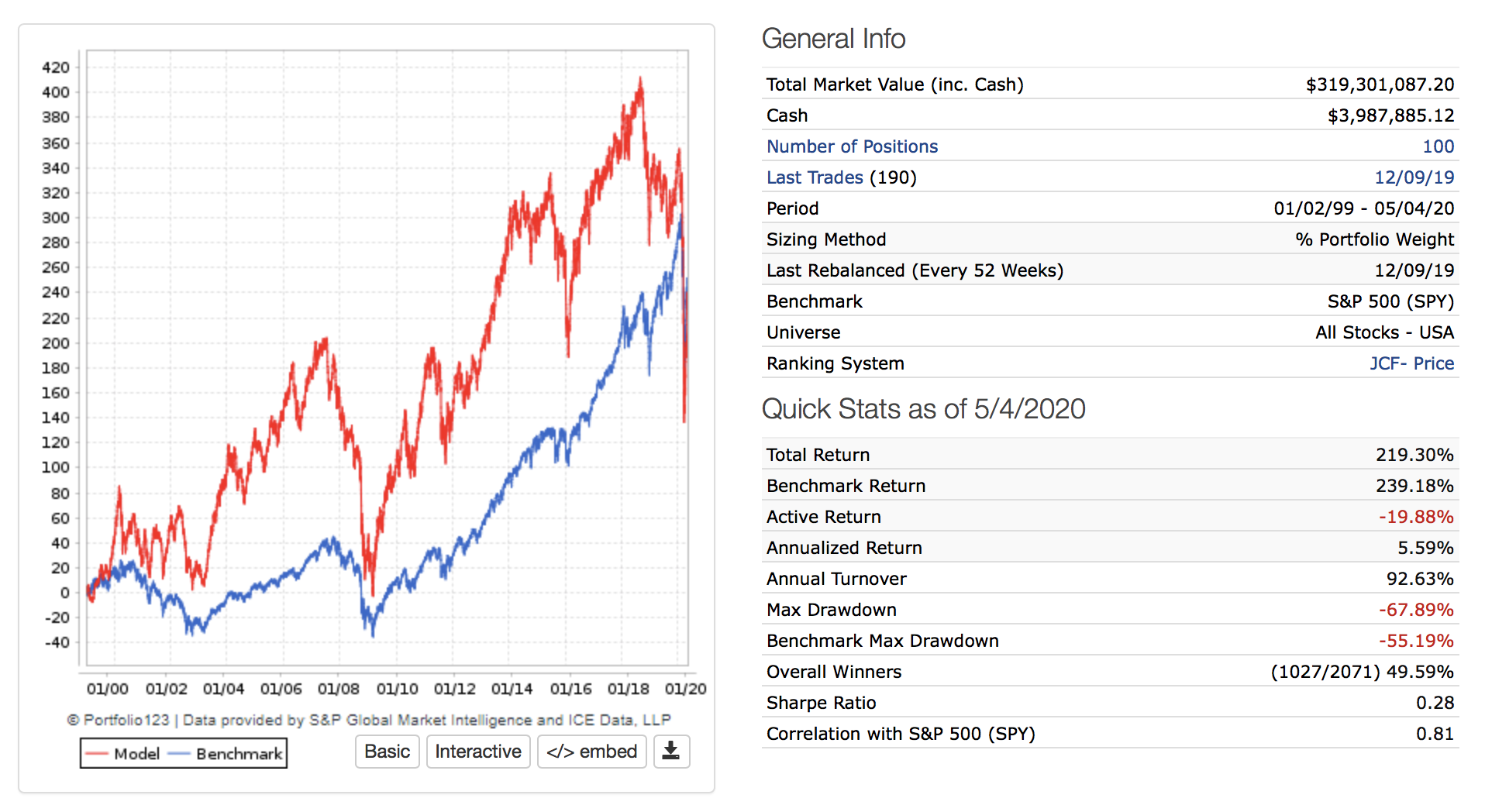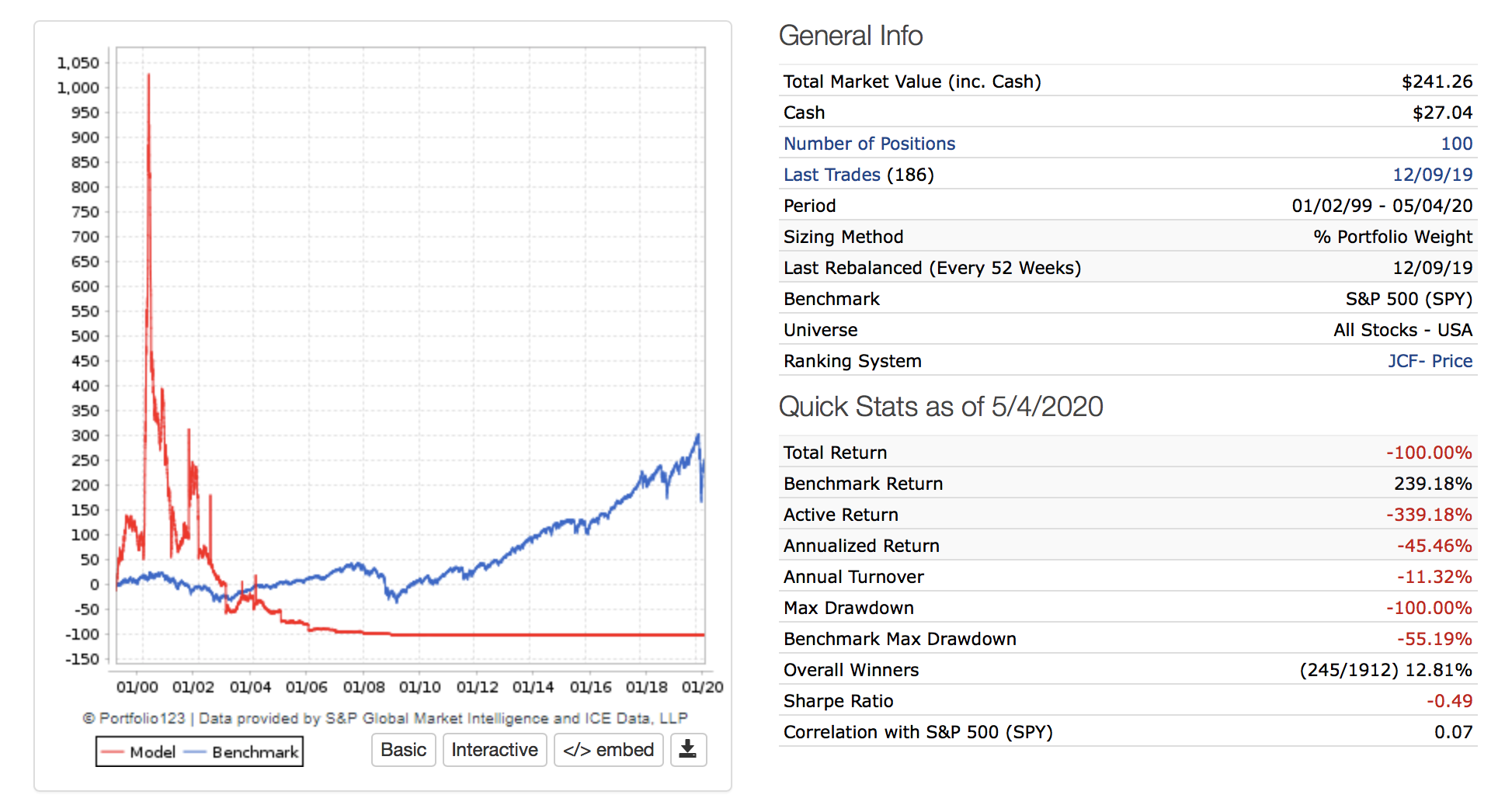 El precio como factor, actúa de forma similar al factor Momentum. De hecho son primos hermanos. Pero el sistema desarrollado en este artículo, si es que se le puede llamar así, comprar solo las empresas más caras, es bastante menos inteligente que un Momentum simple, que ya de por si es muy simplón.