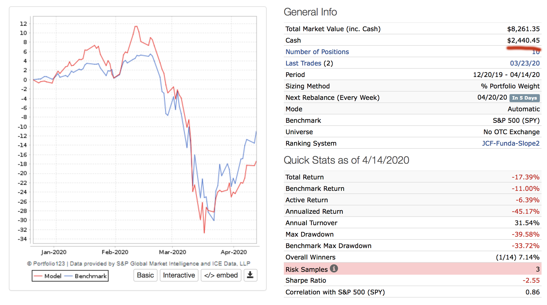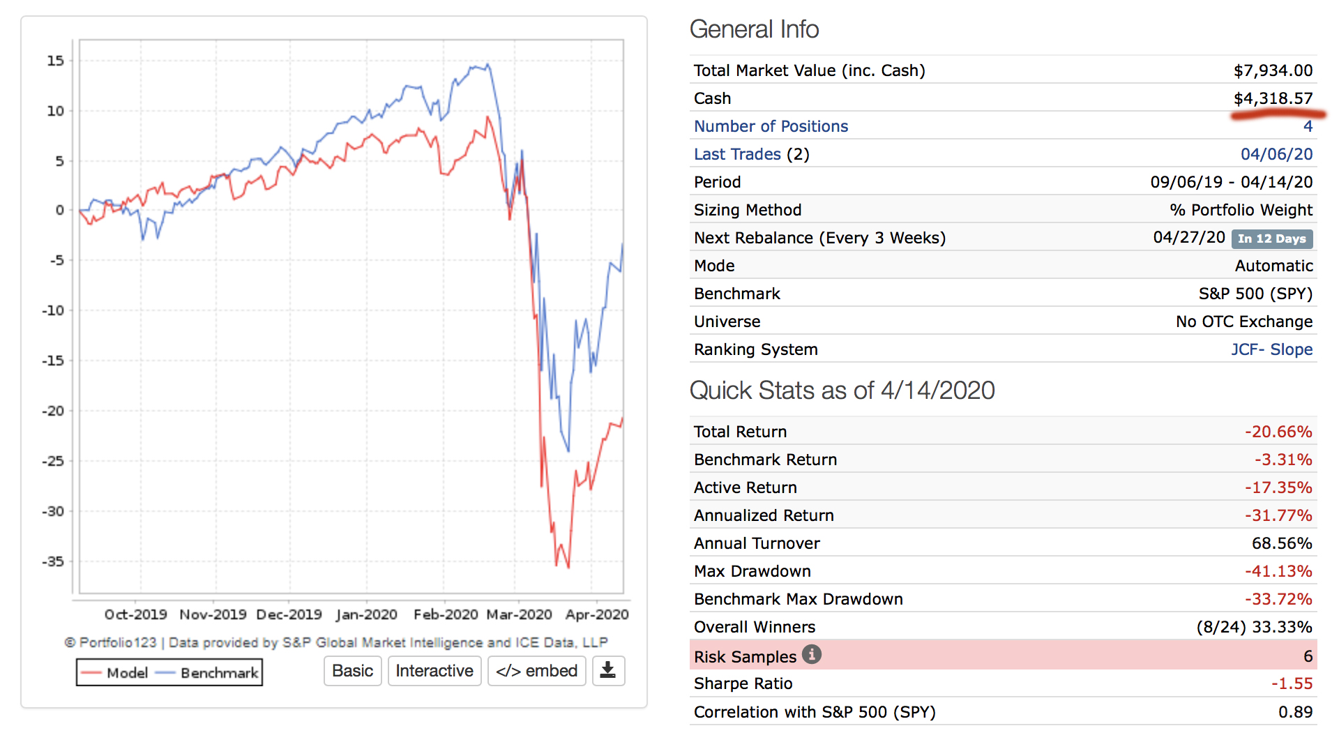Sí nos fijamos en uno de mis últimos artículos, dónde examino el comportamiento de los sistemas que tengo “trabajando”, hay dos de ellos que tienen una cantidad exagerada de “cash”. Son los sistemas Momentum y Small Cap Club. Estos dos sistemas tenían activada la regla de Clenow.