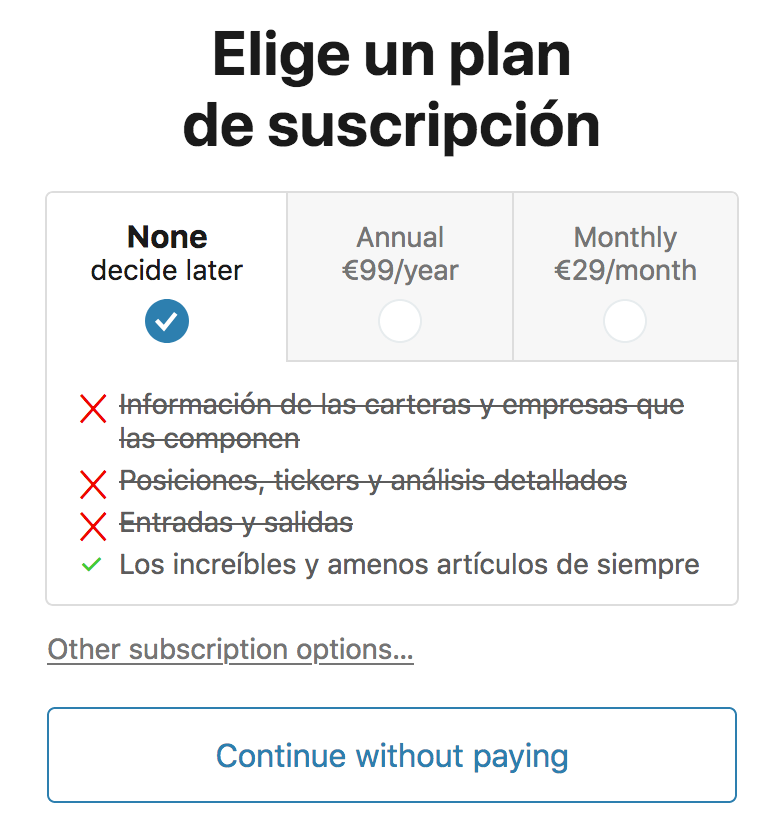 Una gratuita, en la que vas a poder leer los fantásticos y amenos artículos de siempre, y otra de pago, en la que desnudaré las carteras de los sistemas de inversión. Tickers, empresas, movimientos, entradas y salidas.