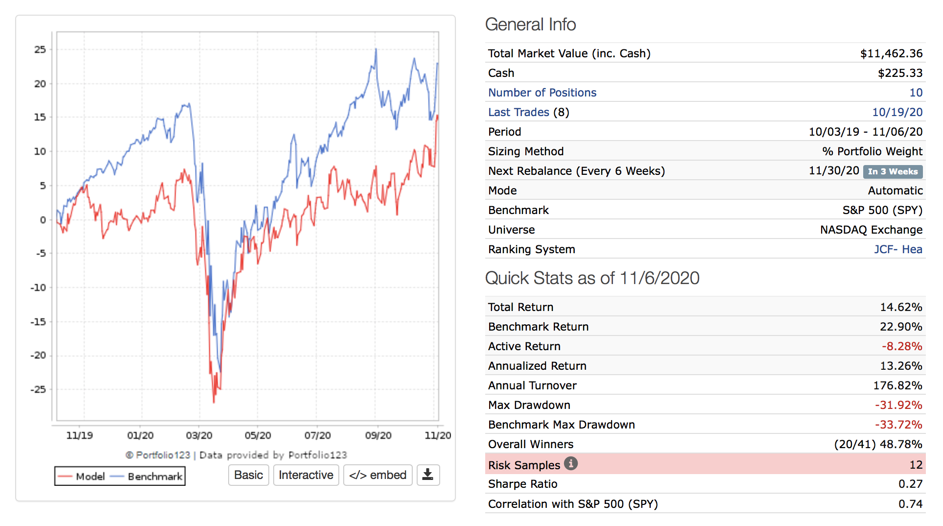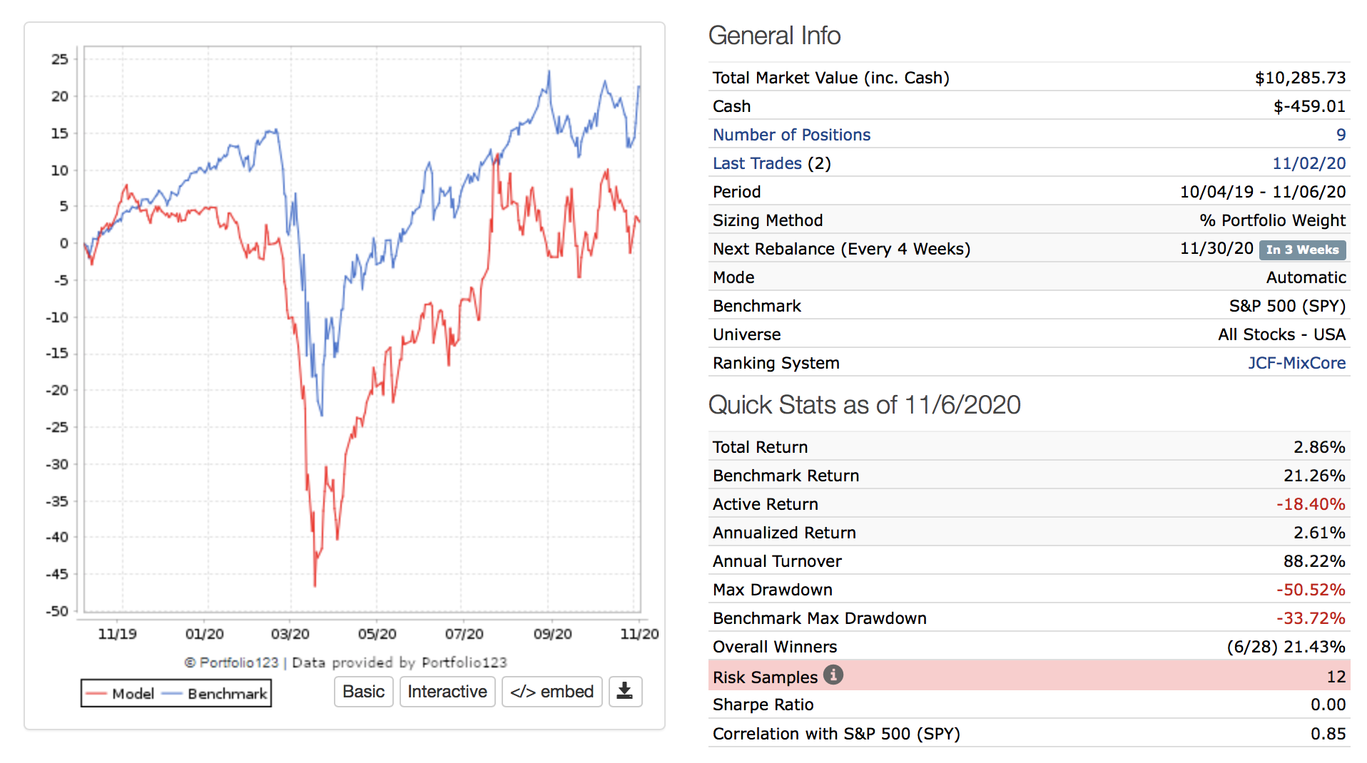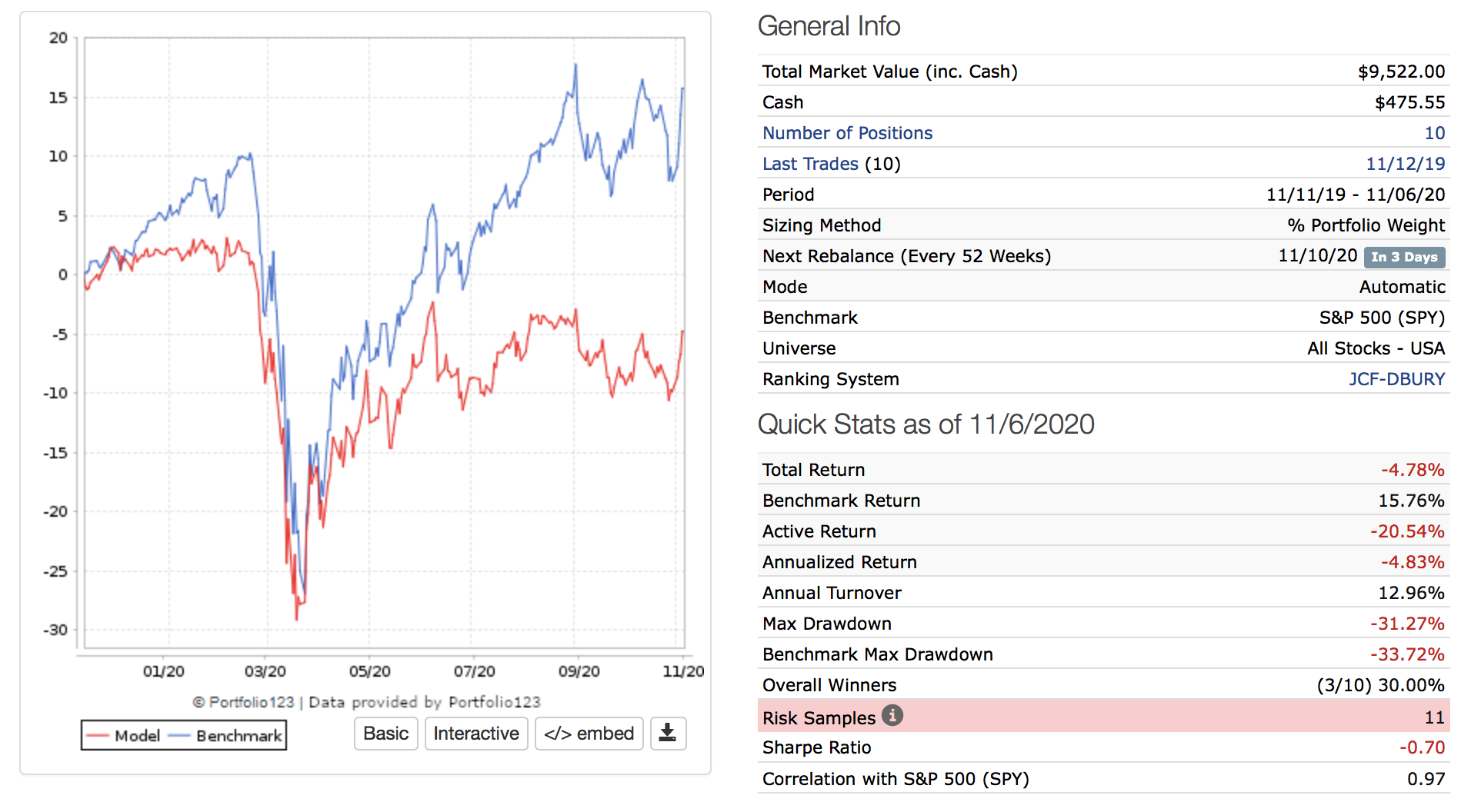 Fue un experimento de una noche de verano. La idea era sencilla, combinar los rankings públicos de Portfolio123 en un solo ranking, cómo si de bloques de código se tratase, para construir un sistema simple y eficaz. Es evidente que la implementación ha fallado.