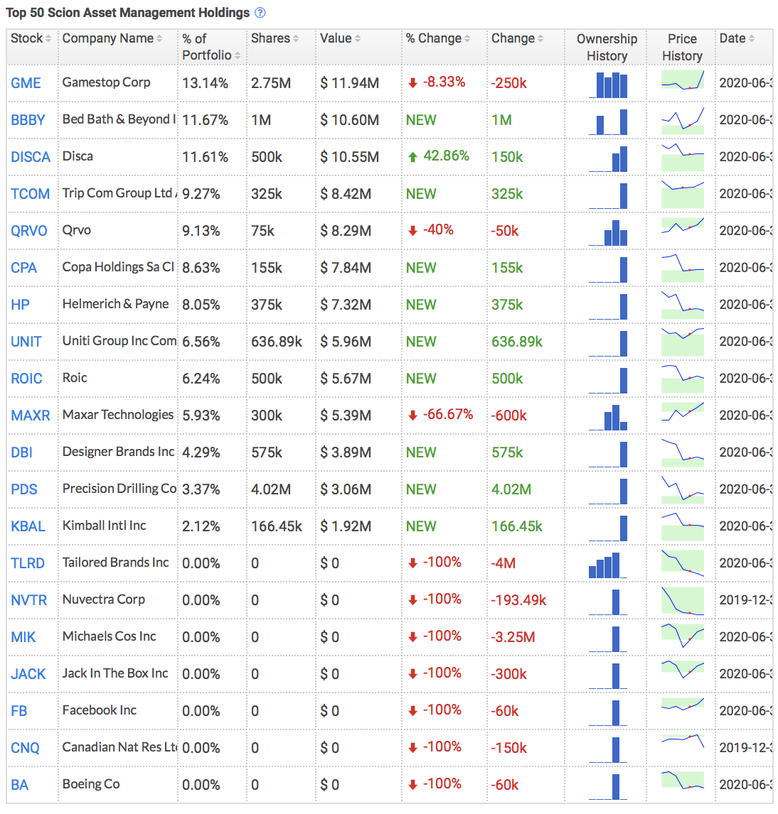 Por otro lado, si comparamos la cartera, con lo que REALMENTE* tiene Michael Burry en su cartera nos damos cuenta de que no hay ni una empresa en común.