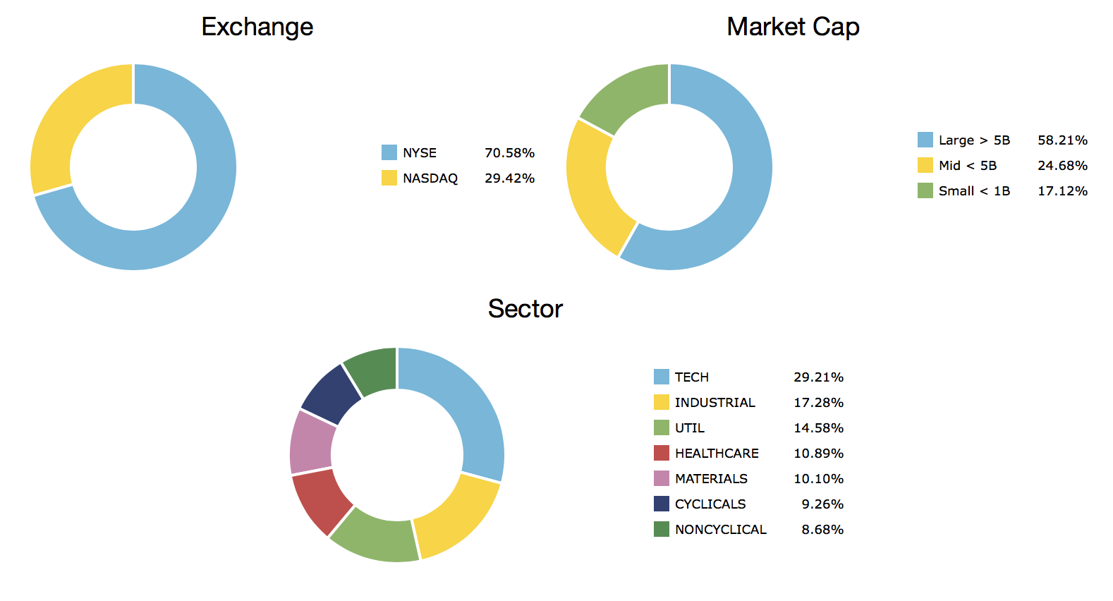 También resulta muy interesante comprobar cómo el resultado final de una cartera de tipo Momentum es un conjunto muy equilibrado. Con empresas grandes, medianas y pequeñas. La cartera también se reparte ella solita entre diversos sectores. El sistema ha comprado empresas en siete sectores.