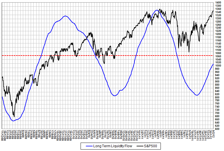 1. Comenzamos con el primer gráfico. Corresponde al Flujo de Liquidez Institucional en el Largo Plazo (periodo de 6 a 12 meses). Como vemos en la imagen, éste es alcista desde finales de octubre. Es ahí donde el inversor de largo plazo debería haber comenzado a meter posiciones alcistas.