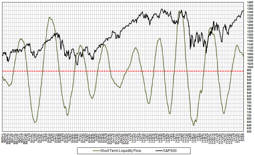 3. El tercer gráfico es el Flujo de Liquidez en el Corto Plazo (periodo de 1 a 3 meses). Si vemos en la imagen, desde finales de enero el flujo es negativo, a pesar de que el mercado ha seguido subiendo.