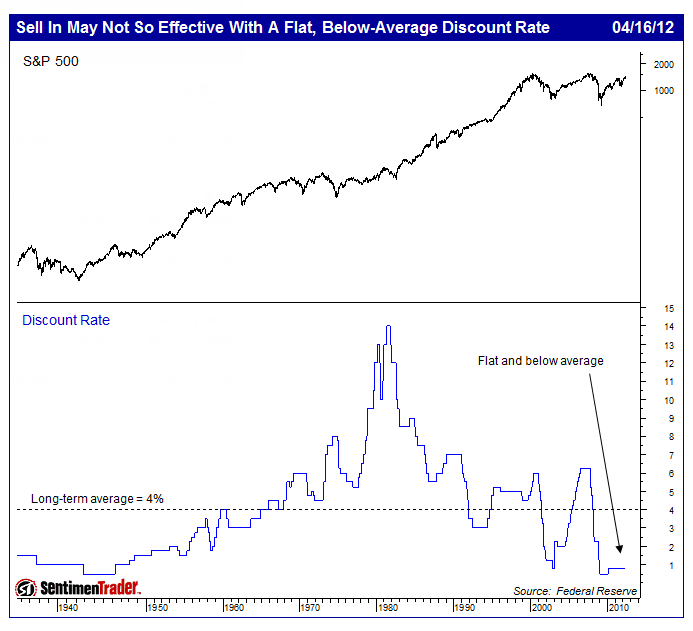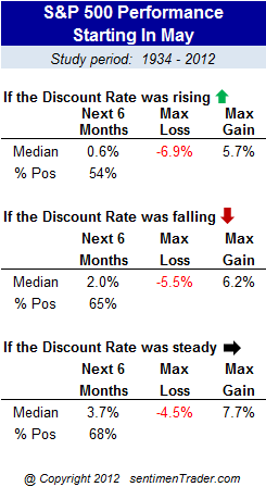 Hoy traigo un interesante artículo de Sentimentrader (ver artículo original aquí), donde se expone el rendimiento del índice S&P500 a partir de Mayo en diferentes condiciones de tipos de interés.