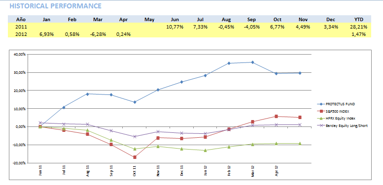 Después del complicado mes de Marzo y de realizar algunos cambios en nuestro sistema de gestión de riesgo, volvemos a la carga. Ayer, Protectus cerraba Abril con un retorno del +0.24% frente al -0.75% del índice S&P500, lo que nos sitúa en una rentabilidad del +29.67% desde los inicios (Junio 2011) frente al 5.09% del S&P500 en el mismo periodo.