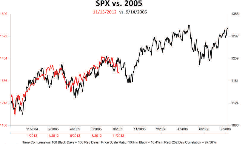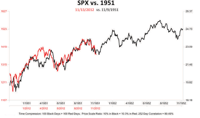 1967, donde la correlación de corto y largo plazo es muy alta, tiene de momento todas las probabilidades a su favor. Después del rebote, el S&P500 iría a nuevos mínimos, pero eso ya en 2013.