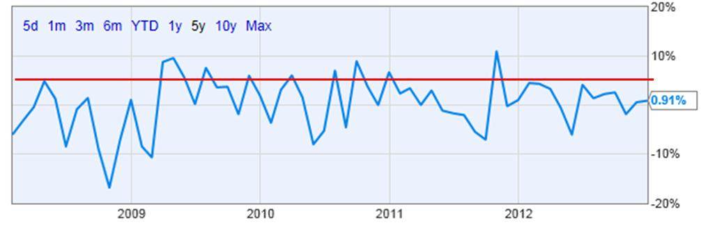 En la siguiente imagen vemos los rendimientos mensuales del S&P500 en los últimos 5 años:
