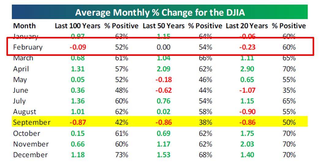 Febrero es un mes estacionalmente bajista, con un retorno medio del -0.23% en los últimos 20 años: