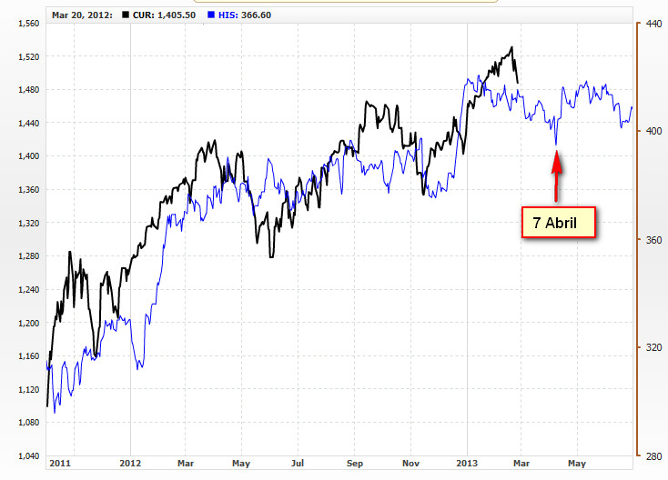 Vamos a ver tres gráficos del S&P500 y sus correlaciones con otros años. Todos ellos poseen una alta correlación (entre el 90 y el 92%). Sin embargo, los resultados son totalmente distintos.