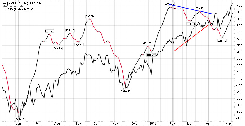 Ese movimiento significaba el fin de la corrección que empezó en Febrero. Sí, una corrección Alcista, signo de la gran fuerza que tienen las bolsas. Esta corrección puede verse más claramente en el índice de acumulación NYSI. Observamos la divergencia entre estos dos índices durante estos meses: