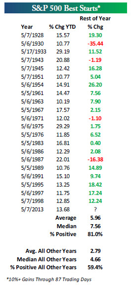Cuando esto ha ocurrido en otros años, las probabilidades de continuar subiendo son muy altas (81% de las veces), con un rendimiento medio extra del +5.96% (fuente: Bespoke, vía www.tgcapitalgroup.com)