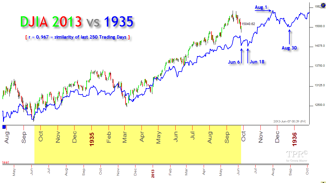 En la siguiente imagen vemos una correlación muy fuerte del mercado actual con el de 1935. Hilando fino, tenemos las fechas de mínimos el 06 y 18 de Junio: