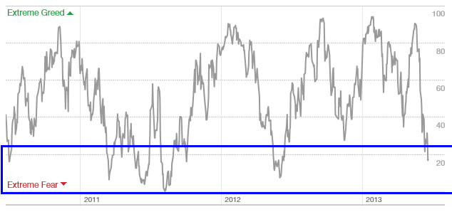 El nivel de volatilidad y miedo se ha incrementado bastante en estos últimos días. En la siguiente imagen vemos el nivel de miedo a largo plazo, ya en zonas de formación de suelo de largo plazo (que perfectamente podríamos necesitar todo el verano).