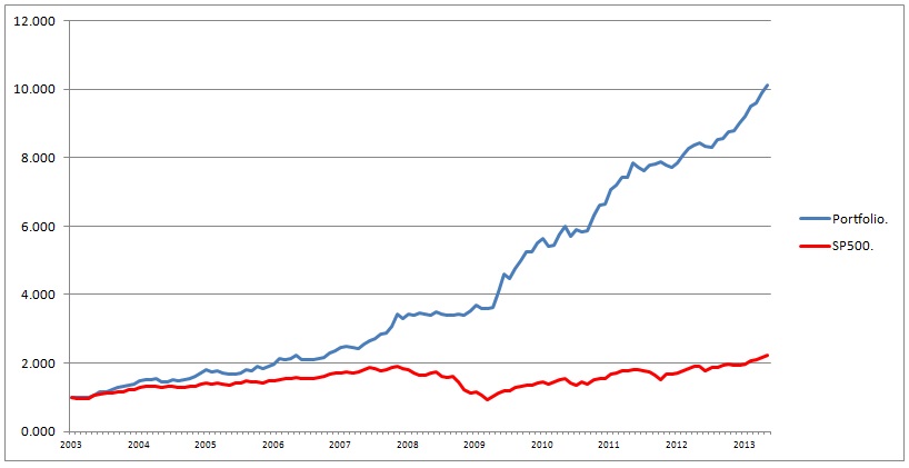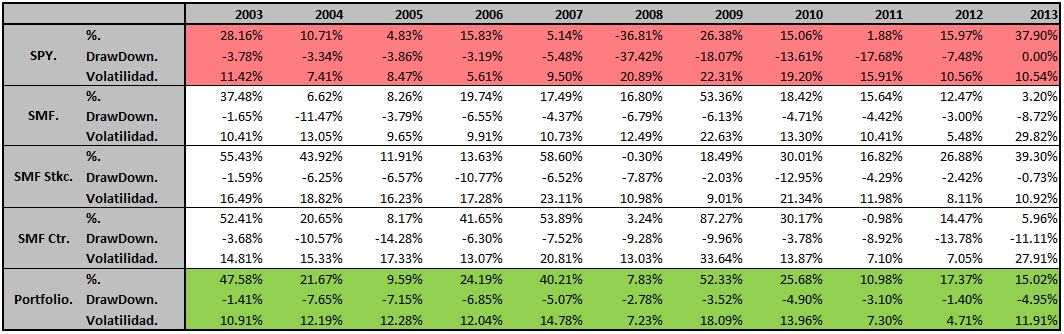 Podemos observar que es un sistema muy robusto y rentable, aunque tiene cierta desviación (15% aprox.). Vemos que hay años en los que el sistema ronda el 40% de rentabilidad anual, mientras que otros años se queda en un dígito, sobre todo los años en los que el S&P500 se ha movido muy lateralmente o bajista.