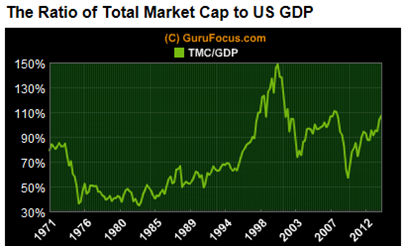 El mercado de acciones está ligeramente sobrevalorado, si lo analizamos mediante el ratio Capitalización/GDP. Ahora mismo ronda el 110%, siendo su "fair value" (precio justo) el rango 70-90%, pero no significa que no podamos subir más (para prueba años 2000 y 2007).
