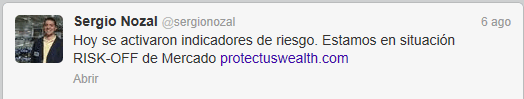 Por un lado, hablo de activación de señales o indicadores de riesgo, lo que significa que deberíamos tomar precaución reduciendo riesgos, ya sea buscando liquidez, añadiendo coberturas o ambas. Al decir "activación de riesgo", uno puede pensar que estaríamos en modo "risk on", pero es justo lo contrario.