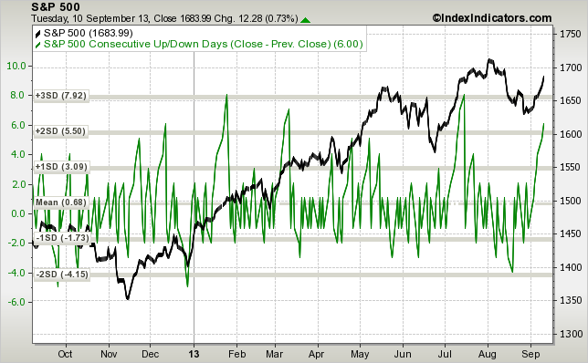 Al cierre de hoy, el S&P500 marcaba su séptimo día consecutivo con cierre alcista, lo que nos deja en una situación de alta probabilidad (casi 3 desviaciones estándar) para que mañana tengamos un día bajista: