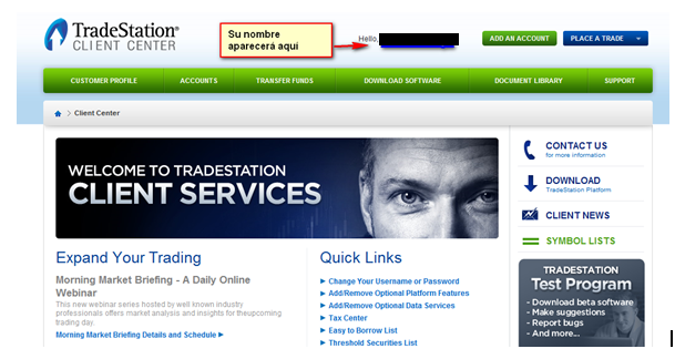 Finalizada la fase administrativa de contrato y creación de cuenta, el inversor recibe un usuario y contraseña por parte del bróker, con los cuales podrá acceder al "Client Center" de TradeStation.