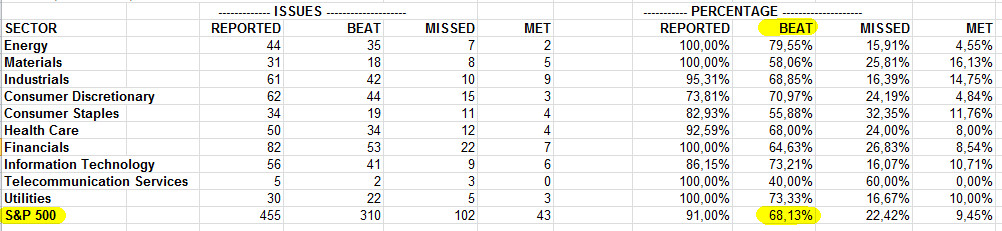 Hasta la semana pasada habían reportado el 91% de compañías del S&P500, de las cuales el 61% han batido expectativas: