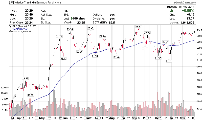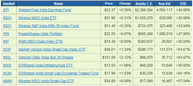 Por liquiez, EPI (WisdomTree India Earings Fund) sería la mejor opción, con un +34.0% de rentabilidad en lo que va de año: