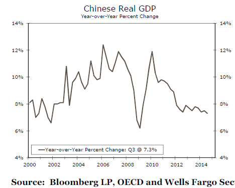 China, la segunda economía más grande del mundo, presenta un crecimiento del 7.3% en el Q3 2014, aunque la tendencia es bajista desde hace cinco años. Las estimaciones del FMI para el 2015 son del 7.4% de crecimiento, y del 7.1% para el 2016. De materializarse, China contribuiría al crecimiento global con un 1.2%: