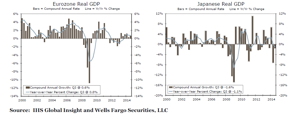 En Europa, el crecimiento se ha estancado en los dos últimos cuartos, siendo el dato actual del 0.8%. Todo indica a que las medidas de política monetaria implementadas por el BCE acelerarán el crecimiento en los próximos meses. Las estimaciones de crecimiento para la Eurozona, para el 2015, son del 1%, lo que se traduciría en una contribución global del 0.1%