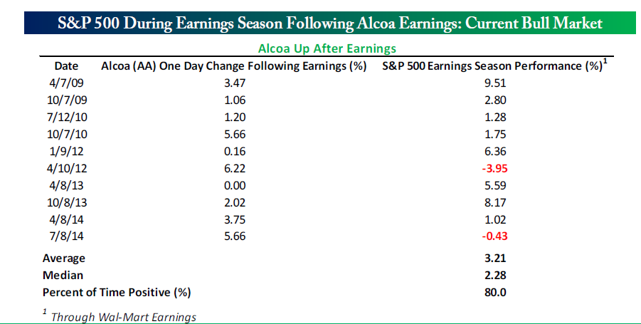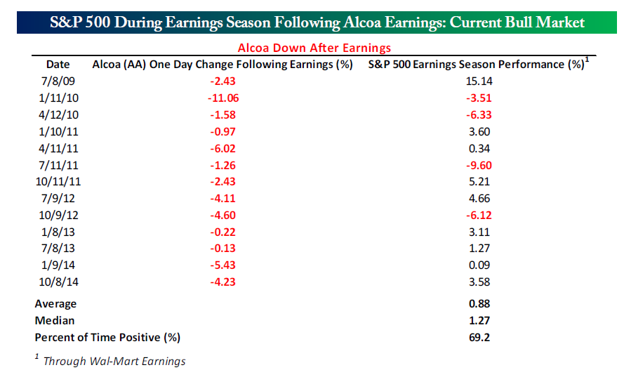 Alcoa es considerada un barómetro de mercado, de forma que según cómo reaccione después del informe de beneficios, así lo será la temporada completa (hasta Wal-Mart). Si Alcoa sube después del "earnings", se espera que el mercado haga lo mismo en las próximas 5 semanas. Por el contrario, si AA cae, indicará debilidad de mercado para el resto de temporada.