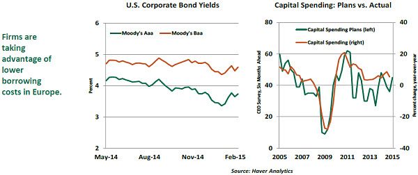 Gracias al programa cuantitativo del Banco Central Europeo, el gasto en equipamiento se podría incrementar. Después del anuncio de 1.1 trillones de Euros por parte del BCE, las rentabilidades de los bonos cayeron a mínimos, siendo la rentabilidad media de los bonos corporativos en Europa del 1.08%, mientras que en Estados Unidos se está cotizando por encima del 3.50%.