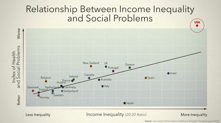 Con la siguiente imagen expone cómo esas grandes diferencias entre ingresos tiende a generar mayores problemas sociales, siendo Estados Unidos el país con la peor relación: