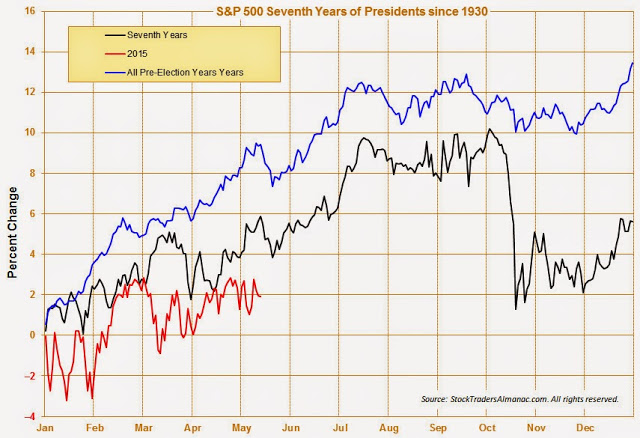 Y en línea negra tenemos los años 7 del ciclo presidencial. Es decir, aquellos años 3 del ciclo cuyo presidente repite mandato, tal y como está ocurriendo en 2015 con Obama.