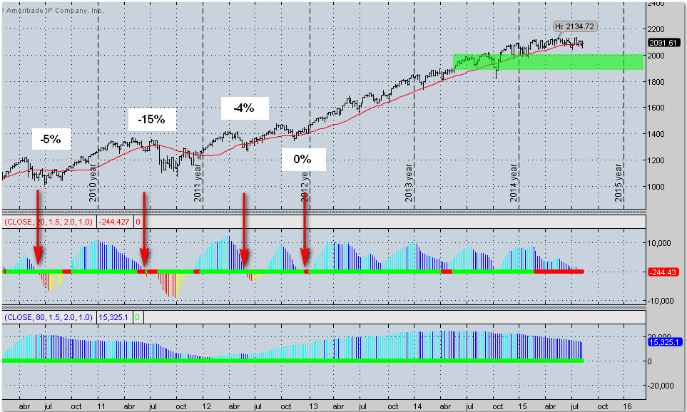 A largo plazo (indicador inferior), observamos que está todavía por encima de cero, marcando un mercado alcista. En concreto desde 2010. A medio plazo, el otro indicador nos muestra las correcciones del S&P500 dentro de la tendencia alcista. Y actualmente, este indicador está dando señal bajista.