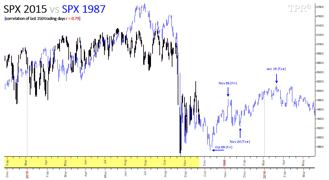 Por un lado tenemos la corrección del año 1987. De repetirse el patrón, a primeros de octubre tendríamos ese último impulso bajista.